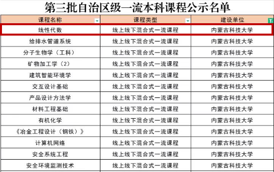 近日自治区教育厅公布《关于第三批自治区级一流本科课程认定结果的公示》,公司《线性代数》课程获批自治区级线上线下混合式一流本科课程。